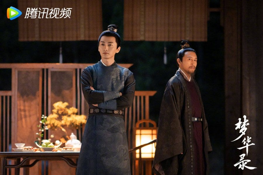 Chen Xiao is a mixed bag for me. When he’s good, he’s good (he smiles so prettily) but he’s not consistently fun to watch. The mopey thing he does even in Queen Dugu is a downer. I’m fond of brooding actors but for some reason he just doesn’t do it for me. The character of Gu Qianfan on the other hand has depth and aspects. Those come through a little when he’s interacting with Zhao Pan’er but in all honesty, his relationship with his father fascinates me so much more. Dad is an intriguing fellow. At this point he’s my favourite character because he doesn’t quite comport himself in the way you might expect someone of his rank or breeding to. On some level he is the stereotypical aristocratic official but in other ways, he has a delightful taste for the irony. He’s well aware that he’s not a “good” person and he knows that he’s playing a much bigger game. I love that scene where he raises his sights to the sky talking to the spirit of Qianfan’s deceased mother after a heated argument with Qianfan who walks away in a huff. He’s absolutely gleeful that his son has gotten angry with him… thrilled to bits that his son who is always ceremoniously polite to him has finally raised his voice and shown some emotion. This tells me that Dad is a shrewd operator and not as straitlaced as one might expect. Or at least with no pretensions to being straitlaced. He is able to see things from different perspectives. Clearly the estrangement hits them both hard and one wonders why there is one in the first place. (I have a few ideas about that) But despite the son’s concerted efforts to distance himself from the paternal side of the family, the father happily applies his knack for meticulous planning towards the welfare of his son.