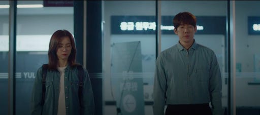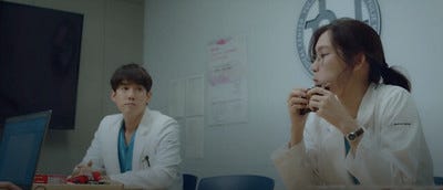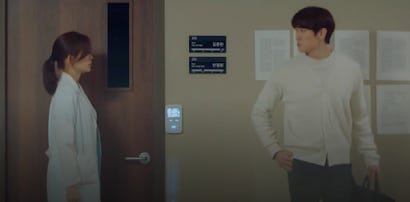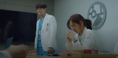These days I've become very fond of the WG dynamic. I liked Gyeo-ul first and then I gradually became fond of Jeong-won. Even in Episode 3 I could see what the showrunners were doing but I didn't get onboard from the start because I don't watch medical dramas for romance. At around Episode 5 I became convinced that the show was serious about developing a connection between them so I climbed into the bandwagon prepared for the fact that this was going to be the stuff of slowburn. An aspirant to the priesthood being paired up with a shy unassuming 3rd year GS resident... it wasn't going to be love at first sight. (Love at first maggot maybe) But the show seemed to be tying their dynamic to the question of whether Jeong-won was staying or leaving. Time and time again, there were voices saying that it was a one-sided crush. This is how it went... Jeong-won is Mr Nice Guy and he's lovely to everyone. He's not romantically interested in Gyeo-ul blah blah blah. You know the drill. Of course I kept an open mind but over time, the charge that it was a one-sided crush became less and less convincing. Especially when the camera continued to firstly, focus on Jeong-won's reactions to Gyeo-ul's doings and then frames them together in shots as they interact in the ER, the PICU and of course the OR. Why do that... if she's just a "side" character with a cute "one-sided crush"? It made no sense to me unless I am supposed to conclude that Ahn Jeong-won notices or interacts Jang Gyeo-ul in a way that is outside the norm.