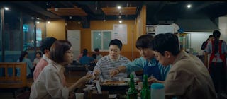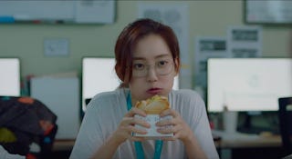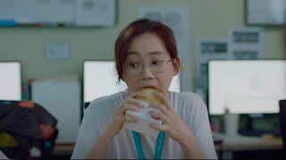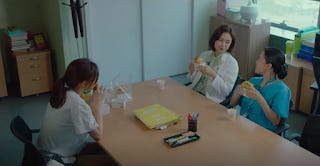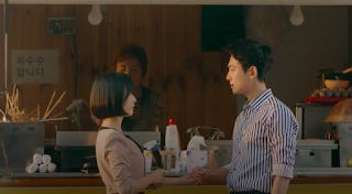 Both the parallel track that Jun-wan and Jeong-won extend to Ik-sun and Gyeo-ul (their respective potential romance partners) as we see both women eating toasted sandwiches here. One receives an unexpected confession and the other talks about her inexperience with romance.