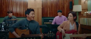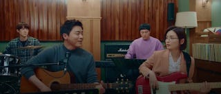 After this the show cuts to the band practice of them singing "I Knew I Love". Ik-jun is on lead vocals again then in looks at Song-hwa in meaningful fashion but again she looks uncomfortable at first. When the song ends, it cuts to Chi-hong reminiscing about the first day he met Song-hwa 3 years earlier mistaking her for an intern.