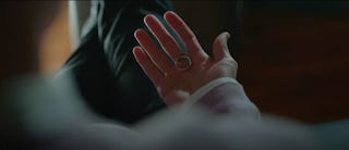 At the back corner of the room is Jun-wan pensively thinking about Ik-sun. This is supported by a flashback of a conversation between them of past romances. In it Ik-sun tells him that she was able to move on from her ex because of him. She's well-aware that the good times don't always last but she wants them to make happy memories together during the good times. Then the camera cuts back to the karaoke lounge and sees him reach into his jacket pocket and pull out a ring that he had prepared to give to her earlier but held back because she insisted that she doesn't want any kind of jewellery from him.