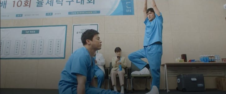 The table tennis tournament has to be one of the funniest moments if not the funniest moment in Hospital Playlist history. When Ik-jun and partner Dr Lee Ji-hoon burst into a dance in a middle of the match to do a “Deux”, I could have keeled over and died. The two are humorously competitive all throughout giving their Orthopedic rivals a run for their money while skating through the rest of the competition. Then there’s the ridiculous trash talking doctor style. I don’t think I’ve laughed this much since we saw various members of Ahn tribe parade through the door one at a time to comfort Rosa in her hour of need. Or was it when Jo Jeong-seok walked into the ER with his Darth Vader helmet? Hard to say. The difference is miniscule undoubtedly. But the antics of those who gather around the table tennis table are an unerring source of entertainment. As always it’s a treat to have Yoo Jae-myung on our screens. He can always be relied upon to bring something different to the table. And of course who doesn’t look forward to these Prison Playbook cameos come what may. Professor Shin of radiology might be a dunce at ping pong doubles but he embodies the spirit of patient-centric care when he gets off the bus and grabs a cab back to Yulje for a long-term patient in need of immediate surgery.