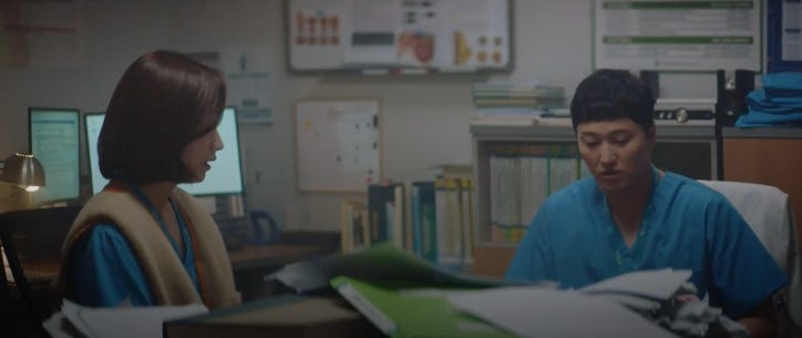 The attention to detail in the writing has always been one of Hospital Playlist’s great achievements. Showing rather than telling is what it excels at. The new fellow attached to the ER is one in a long line of women, obviously thinks that Ahn Jeong-won is a good catch. But she’s too careless with her manner of a man she barely knows and Jeong-won differentially puts up his boundaries instantly. He can’t be what he was last season — going out with every woman in the hospital because she asks. He is a man with different priorities now.