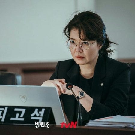 This is why Vincenzo though barrels of fun doesn’t rate that highly with me. Even though Vincenzo is a great antihero on some level and he has a merry assortment of trusted companions, the villains end up resorting to rinsing and repeating bad countermeasures in the latter part of the drama. Jang Jun-woo who started well with his dual identity in the end basically turned into an unimpressive snivelling brat. Choi Myung-hee didn’t fare much better. She went from bad to worse, taking all the wrong lessons from her time in the prosecutor’s office. I can’t believe she (supposedly an intelligent, ruthless woman) would hitch herself to the Babel wagon so completely, putting all of her eggs in that basket with no alternative exit strategy. These two, it seemed to me were reduced to foils for Vincenzo in order that he could act out his darker impulses in order to prove somehow that he is the biggest villain of them all.