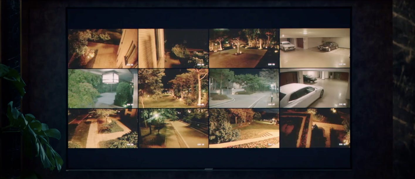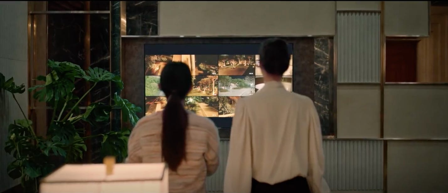 The doll house that has In-hye entranced yet again works as a key to unlocking the writer’s meticulous intentions for the latest episodes. The doll house symbolizes the ideal family and is a metaphor for the functional family that eludes both In-hye and Hyo-rin. In-hye’s personal fixation with the miniature domicile brings to the surface the hole in her heart, the gaping wound of being abandoned by her parents due to their irresponsible antics but especially in relation to money. Hyo-rin, on the other hand, barely copes with the illusion of stability that her ambitious parents present to the world. The so-called happy union between Park Sang-jae and Won Sang-a that they present to the world is a piece of well-constructed fiction that turns the mansion into a living doll house. It is entirely for show (and the cameras). Each member of the household plays their part working from a playbook and any attempt to veer off the script is met with violent disapproval as the Oh sisters have become privy to firsthand. The doll house is a metaphor for control as well as manipulation and there’s a technological equivalent of it via the close-circuit television cameras placed strategically all over the house. The video footage from all the cameras creates a montage that looks like parts of a doll house when viewed on the large television screen.