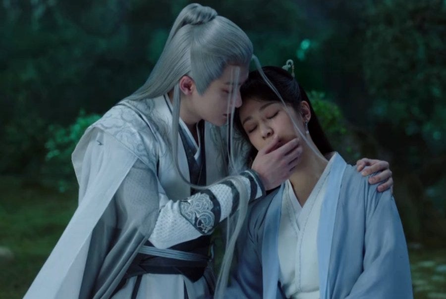 The same can be said about Xiao Yao although I wouldn’t make too strong a case. She too is obsessed with her pain. It’s a bad case of “Physician, heal thyself” so she tries. She believes Tushan Jing to be the one because he’s willing to give it all up for her. It’s a gaping wound she’s trying to fill although the antidote doesn’t seem adequate to task. Certainly not without some help from allies.