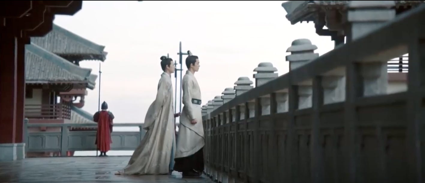 Indeed, Huo Buyi turns out to be a man of seeming contradictions for those who don’t understand the man at his core which serves the plot well on some level. 5 years earlier he gives up on his lady love because he knows she’s disappointed with how he handled the fallout from his revenge. He believes then he will never be forgiven anyway and has lost his right to be alongside her so he tells everyone within hearing that he has no regrets about abandoning her. This has the desired effect and while he is actually harbouring regrets, he labours under the assumption that she will move on with someone else — the most likely candidate being Yuan Shanjian. However, unknown to her although not unknown to Yuan Shanjian, throughout those years in the northwest, Zisheng goes to the aid of people connected to Niaoniao so that she will have peace of mind. As long as she’s happy, he’s happy. So despite the passage of time, his love for her hasn’t waned in the slightest. When he returns he’s still wearing the shao shang string which he picked up from Episode 12 and is remorsefully dismayed that she hasn’t moved on from him — which would explain the oddly cryptic conversation that transpires between him and the empress.
