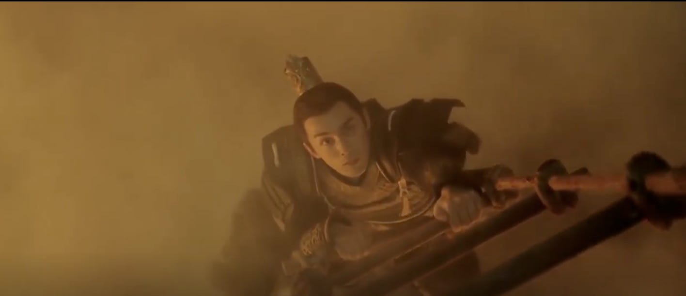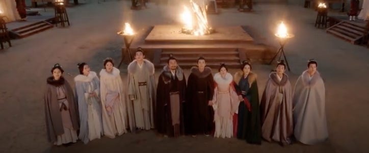 Although I’m quite fond of clashing steel and of things to go boom in dark/bright places, it does seem a bit of a waste of beloved support characters not to have them play a far more pivotal role in bringing the leads together. Why are the friendlies so complacently morose and passive in the post-5-year period only for the Cheng family to all front up on the battlefield at the 11th hour so that we can get a nice family portrait against the night sky at the end? Is that what the Cheng family have been relegated to? Cattle to be herded around to cheerlead the leads after they get together? Perhaps they’ve merely fallen victim to the director’s penchant for dramatic action set pieces and he is rather good at staging them. Dishevelled and sooty, Shaoshang looks rather out of place brandishing a sword in that smoky hellhole but at least she’s got A’Qi and half the black armoured army shielding her from the worst that the enemy has to offer.