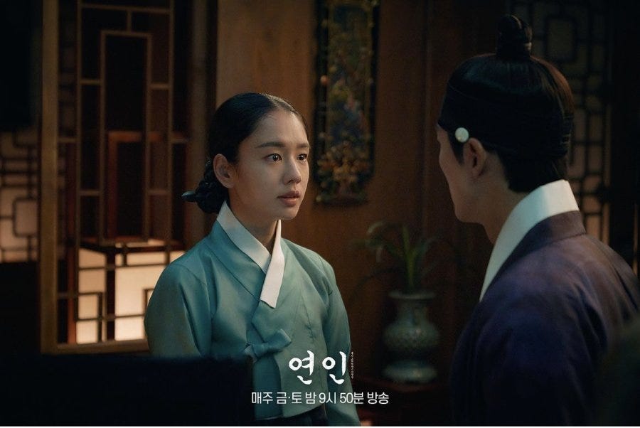 Ryang Eum is a broken soul and no one is allowed to hate him unless the show insists. But it’s obvious that he’s letting jealousy to do all the speaking. Of the people in the world who should understand individual agency, he would be the first in line considering his background with sexual abuse. No one really believes he is motivated by fear for Jang-hyeon’s untimely demise. He tells Gil-chae that she’s a curse because every time she happens to be around, Jang-hyeon gets hurt. It’s the sort of logic that sees my hand make contact with my face. As she’s a woman like no other in her day, Gil-chae flicks off the comment with the contempt it rightly deserves. When she hears that a man is willing to scale mountains, cross the sea and fight off invading hordes for her, what she’s more likely to think is that this is true love. There’s no need to play the noble idiot. Until the man himself does. Logic is not Ryang Eum’s strongest suit because this isn’t really about a fear of Jang-hyeon’s impending doom by association but about him losing “his” Jang-hyeon to someone else. He is witness to the fact that Jang-hyeon is different where Gil-chae is concerned. He turns unrecognizable as the devoted lover of Yoo Gil-chae. All of Jang-hyeon’s affectations of being a playboy who thumbs his nose at social norms sinks down the black hole as soon as the lovers cross paths. He is compelled by a force greater than himself to act like a husband wholeheartedly committed to one woman. He is an exemplar — an outlier too because the world that they inhabit instructs women on how to be worthy wives but give men little instruction on how they should cherish their women. In the same way that the subjects of Joseon are lectured on their obligations to their monarch but it’s mostly crickets on the subject of the king’s obligation to the country’s grassroots. It’s unlikely that they would have heard that line from Peter Parker’s Uncle Ben — With great power comes great responsibility — and taken it to heart.