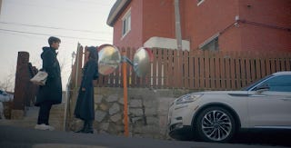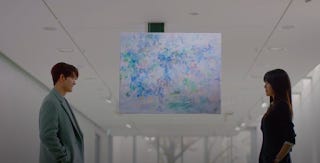 In the scene where they both show up at the art exhibition and ponder over his painting, the shot is framed in such a way to show that while Da-na and Yeong-hwa come from such different socio-economic backgrounds they are are connected by his art. His artistic gaze is the lens from which she can see the world that is closed to her. Perhaps that's enough for a woman who seemingly has everything except genuine affection.