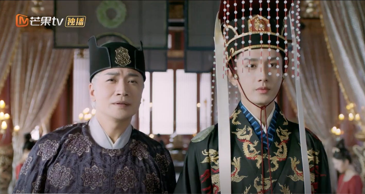 Both leads are fairly new to me. I tried watching The Promise of Chang’an but immediately gave up after hearing about the ending. I’ve never seen Love and Redemption either. Xianxia’s not my cup of tea. They are supported by a very competent cast. Han Dong I know from Under the Power. He plays Prince Guang, Qi Yan’s uncle. Lulu Xuan is the highly intelligent frenemy Qiu Yanzhi who has a shared past with both the emperor and his sword bearer. The big bad here is the intractable Qiu Ziliang, the evil eunuch by Mickey He with the appropriate styling to boot. The man practically screams villain.