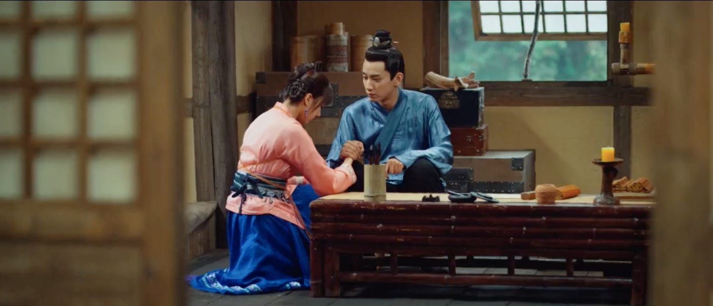 There’s a lovely scene in Episode 22 between leads Jinyu and Chu Chu where she mulls over the injuries on the late Prince Consort’s body. Jinyu, having never met his father, is eager to know how his deceased father lived and suffered as the neighbourhood curiosity. As Chu Chu relates the story of Xiao Heng’s existence away from home living with the pain of his injuries, Jinyu grieves for the father he never knew. The two share not only an emotional bond but an unabashed physical closeness. In that room with no one else present, their dynamic is no longer that of coroner and prince. Nor master or servant. It is a man and a woman having a deep and meaningful moment. Status is rendered irrelevant as this emotional connection is further developed. In this situation they are confidants. There’s no hesitation or awkwardness between them as Chu Chu puts her arm around him in thoughtful consolation. Even before they confess their feelings to one another there’s a thread of empathy that marks their closeness. The normally lofty and confident figure of a prince is unusually vulnerable in front of the woman that he has growing feelings for. Chu Chu is the conduit to a past that’s out of reach. Increasingly she’s become an integral part of his present and future.