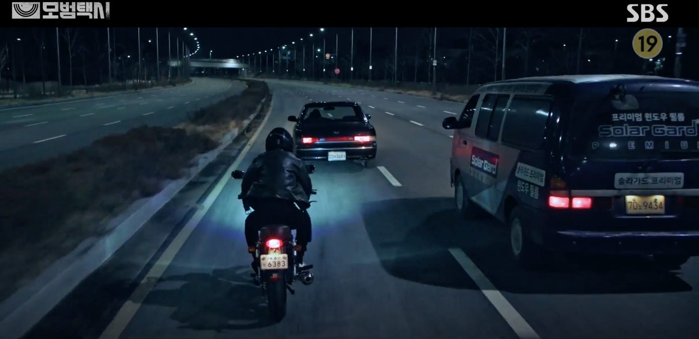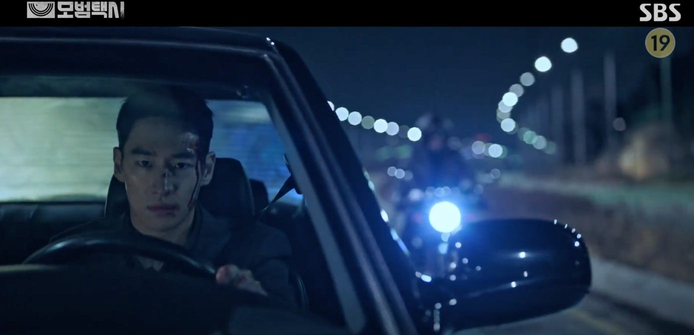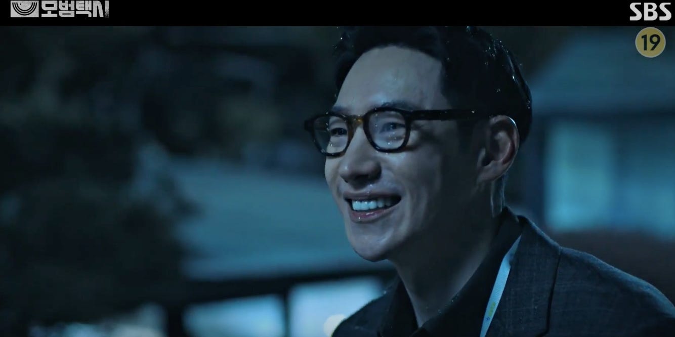 From time to time the Taxi Driver wears a mask (whether it’s a physical one like his spectacles or when he goes undercover as a dork) but at the opportune moment he unveils himself and strikes back on behalf of those who have suffered in the hands of the bullies. When he reveals his face the shock from subverting expectations gains him advantage and he weaponizes it. The anger as a victim of crime and for the those who have suffered is what drives him to put himself on the line. His skill set allows him to get away relatively unscathed while trampling all over the perpetrators who are probably getting a fraction of what they deserve. As the dork, Do-ki is amiable and talkative but when he’s the avenging taxi driver, he is serious, taciturn… and merciless.