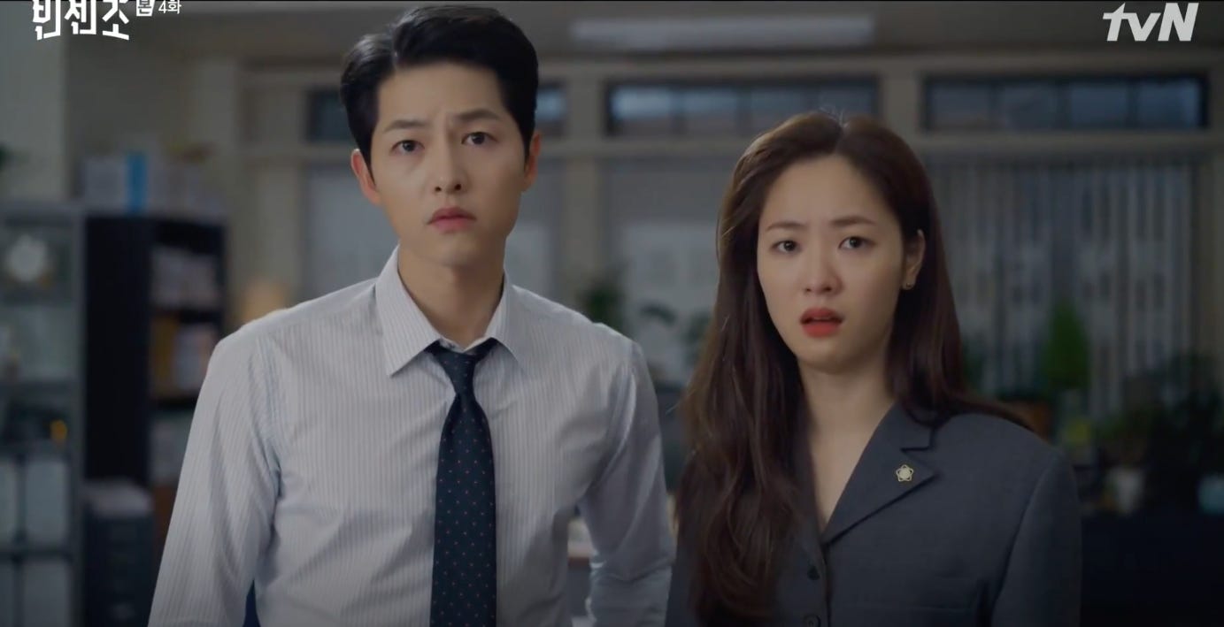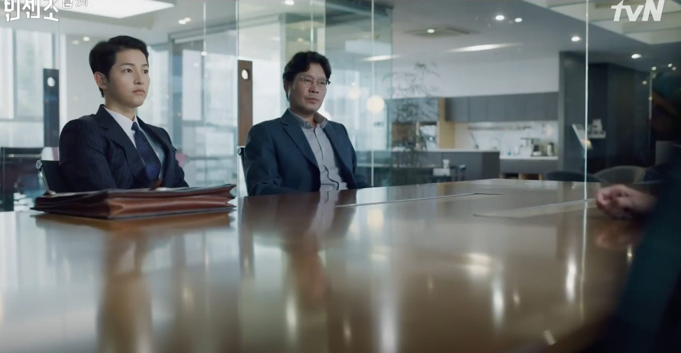 Violence is absolutely the default position for the one dimensional baddies in Vincenzo. It’s supposedly the way to take care of things permanently and or strike terror in the hearts of the victims. But for a man who is no stranger to violence in his line of work, he’s not so easily intimidated. In fact, he’s quite willing to fight fire with fire. Those who see him as an impediment escalate the violence until they realise that they are no match for him in that regard either.