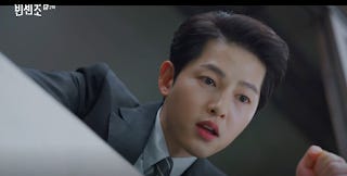 The drama of course has one key ingredient which makes almost everything palatable and that is Song Joong-ki. He oozes with charm and cool in the titular role as a Korean-born consigliere. Our introduction to him as he rubs shoulders with mafia opponents gives him his comparable John Wick moment. In a payback move (orders from his late mentor) he sets fire to a vineyard doused with combustible liquid. His choice of weapon is a Zippo lighter which he plays with symbolizing the fact that there's a dangerous man lurking beneath the well-groomed nicely suited facade. Even while he seems attractive and mild-mannered, he is not someone that should be crossed. Song Joong-ki is terrific in the role playing the straight guy to a host of escapees from a psychiatric facility cast of colourful and emotionally off-kilter characters. Generally the inscrutable Vincenzo keeps his cool while everyone else hits the panic button in ways that can be considered farcical. The occupants of Geumgang Plaza are a jarring and raucous reminder that the drama should be viewed entirely as a farce.